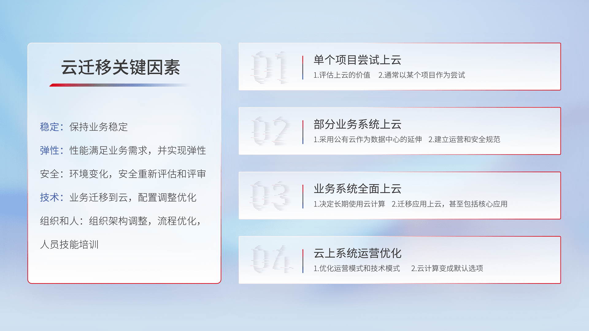 结合实际业务,,,,从规划设计、、、云平台选型、、、云原生改造、、、数据迁移、、、集成交付,,迁移全过程为客户识别最佳上云路径,,,做好风险识别管理,,,,设计网络架构、、身份权限、、、、安全审计合规、、、、操作审计、、日志审计、、监控告警策略、、、多站点容灾设计等,,对云上基础设施进行整体规划,,,提升IT治理水平,,以满足弹性、、、高可用、、、高性能的需求。。。