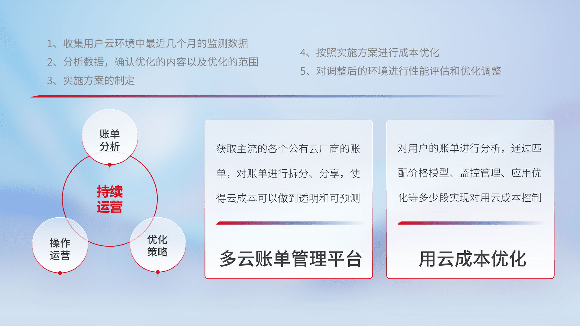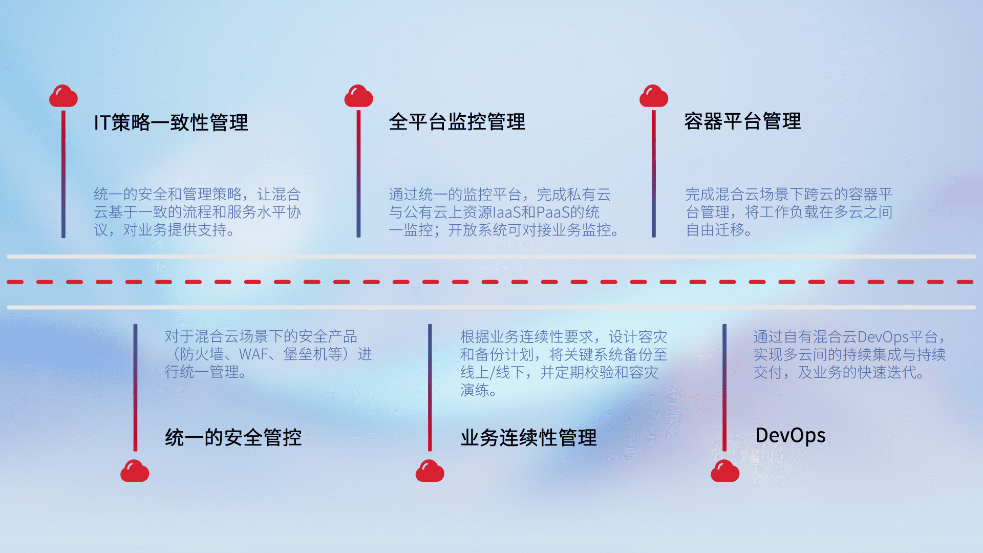 通过多云纳管,,以统一的资源数据模型把客户的云资源进行抽象和封装,,,进而实现对多云资源的统一操作,,,,保障云资源管理的可靠性、、稳定性与可用性。。。。量身定制化运维内容,,,,配置、、、、开发运维、、、补丁管理、、、、备份、、监控、、、、认证和访问管理、、、、审计和日常巡检等,,,,保障在用云过程中的可靠度,,,稳定度以及高可用率。。